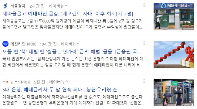예대마진 = 대출 이자율 - 예금 이자율 = 5% - 2% = 3%