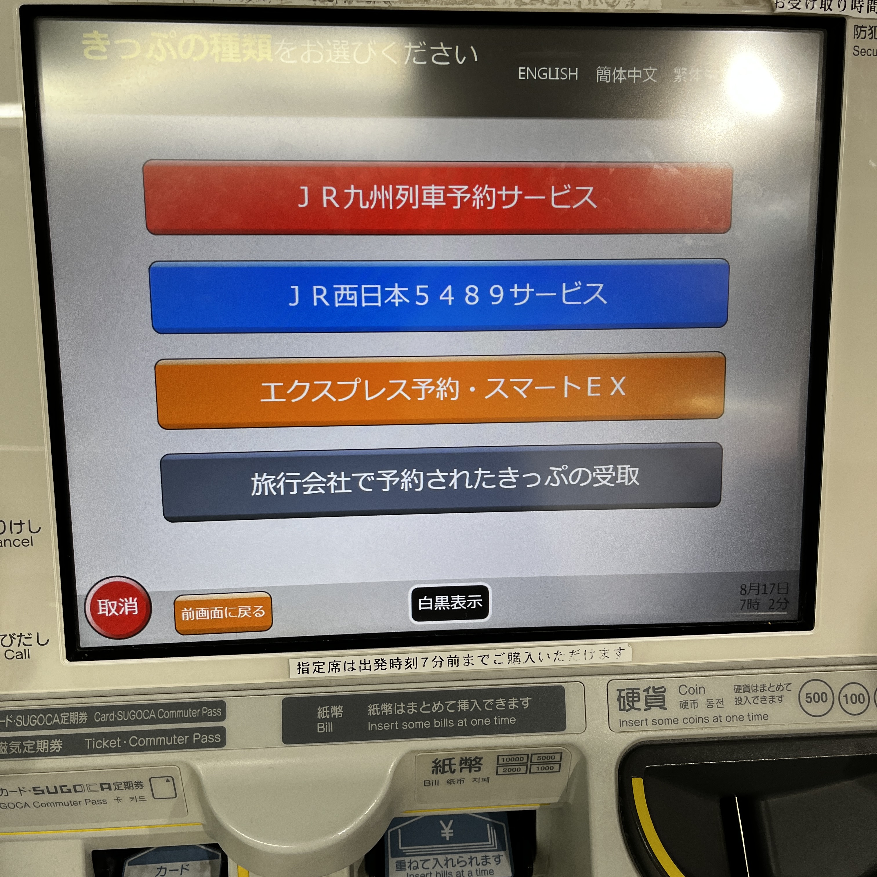 발권 과정에서 한 가지 팁을 드리자면, 기계에서 언어를 선택할 때 한국어보다는 일본어로 진행하는 것이 좋습니다. 저희도 처음에는 한국어로 선택했는데, 예매 내역을 찾을 수 없다는 메시지가 나와서 당황했습니다. 그런데, 일본어로 변경하여 진행하니 정상적으로 발권이 이루어졌습니다.