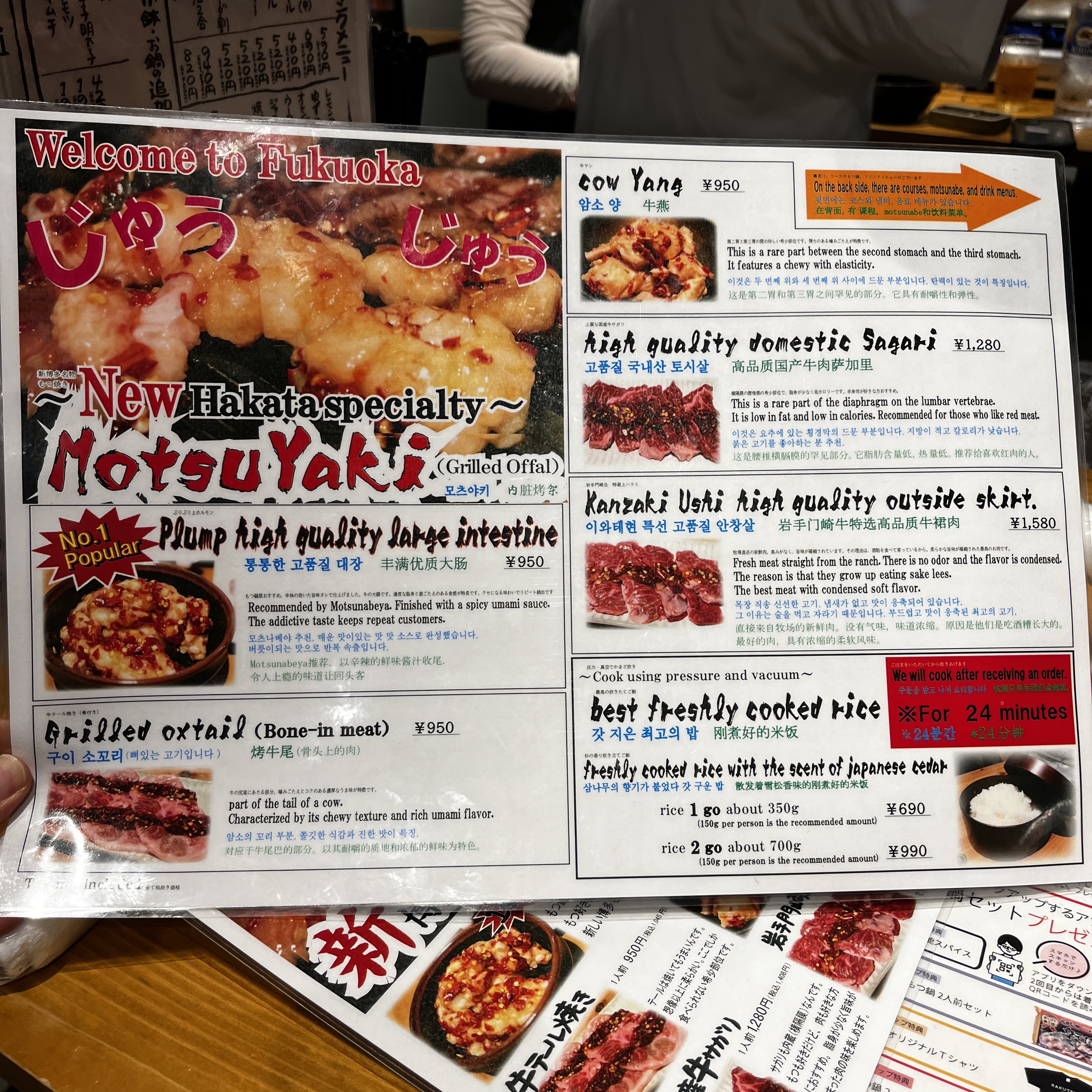 메뉴판에 국문/영문이 잘 되어있어 주문하기 어렵지 않고, 메뉴 각각에 대한 간단한 설명이 있어 이해하고 주문하는데 어려움이 없습니다. 코스요리에는 두부와 명란, 김치가 포함되어 있어 일본 반찬도 맛볼 수 있고요, 메인메뉴인 모츠나베에는 신선한 부추와 양배추가 많이 들어있어 비타민도 접할 수 있습니다. 참고로 예약도 가능하기 때문에 구글로 예약해 주시면 시간에 맞게 자리가 준비되어 있어 웨이팅을 줄일 수 있습니다.