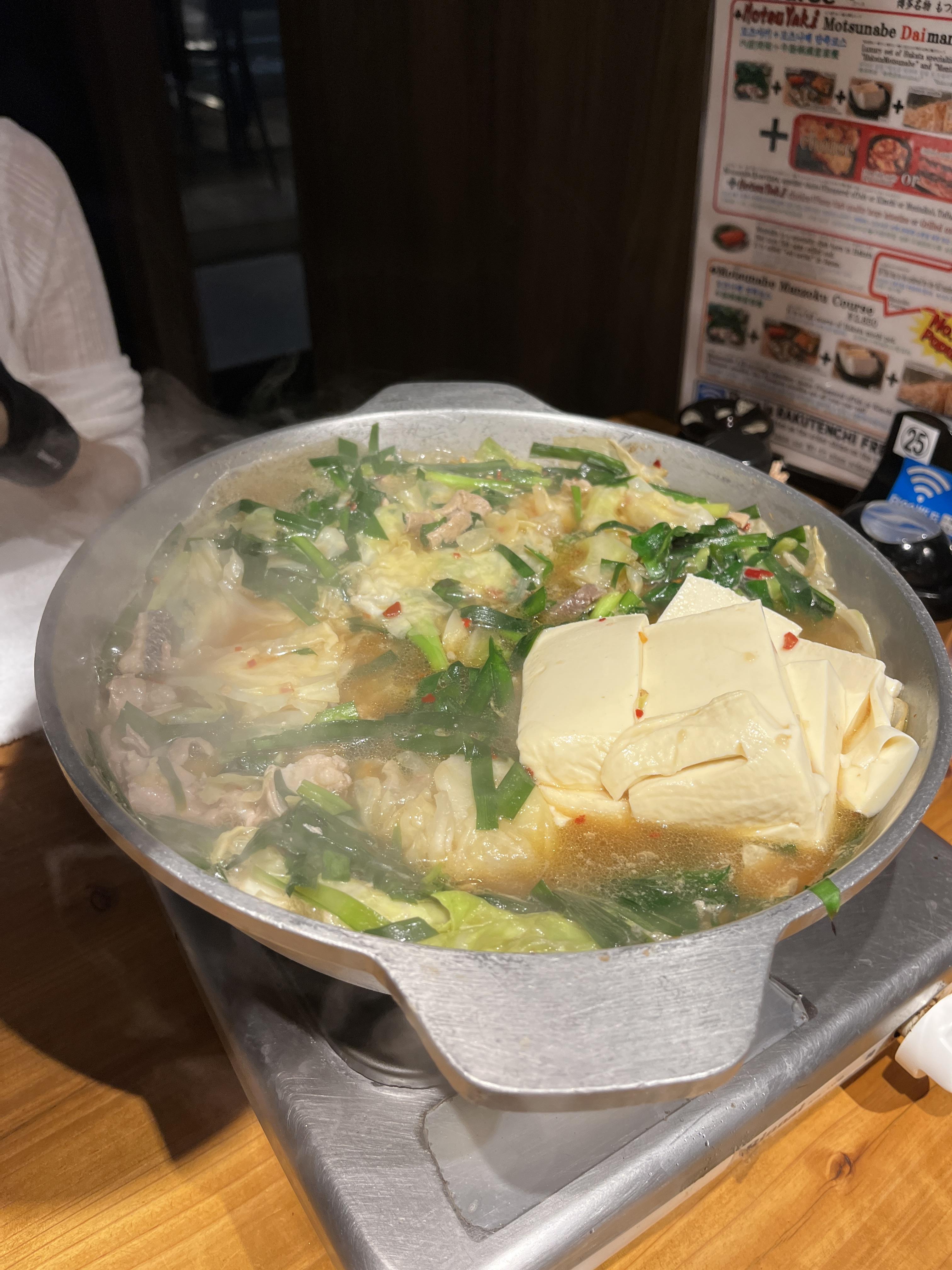 저녁 식사로는 후쿠오카의 대표 음식인 모츠나베를 먹었고, 모츠나베는 돼지고기와 다양한 야채가 들어가 있는 일본 전통적인 국물 요리로, 그 특유의 깊고 진한 맛이 사람들에게 사랑받고 있습니다.