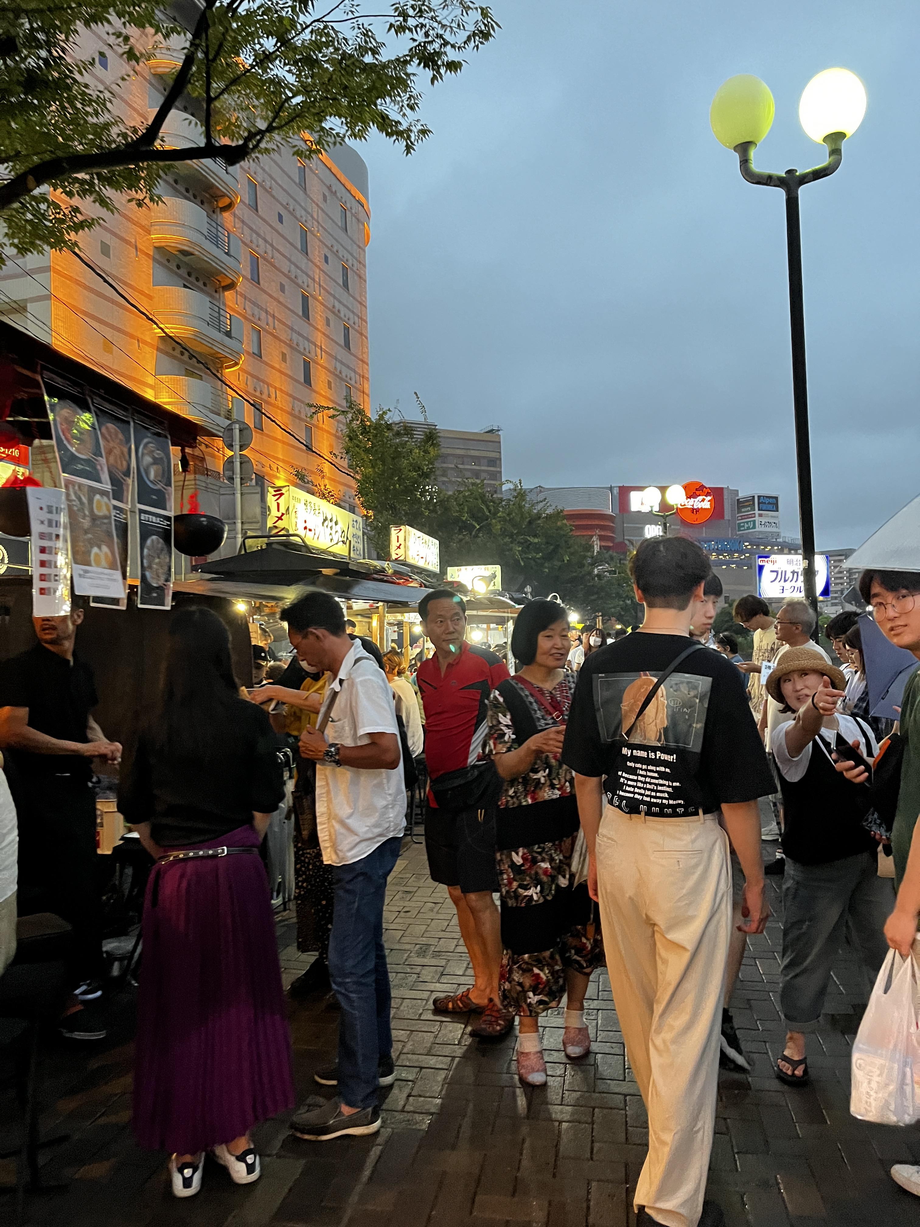 저녁이 되고 나카스 포장마차로 향했는데, 이때 비가 많이 와서 우산을 하나 샀습니다, 거리에 줄 지워 세워진 작은 포장마차에서 후쿠오카의 대표적인 길거리 음식들을 즐겼습니다. 이때까지 몰랐습니다. 3박 4일이 이렇게 짧을지..