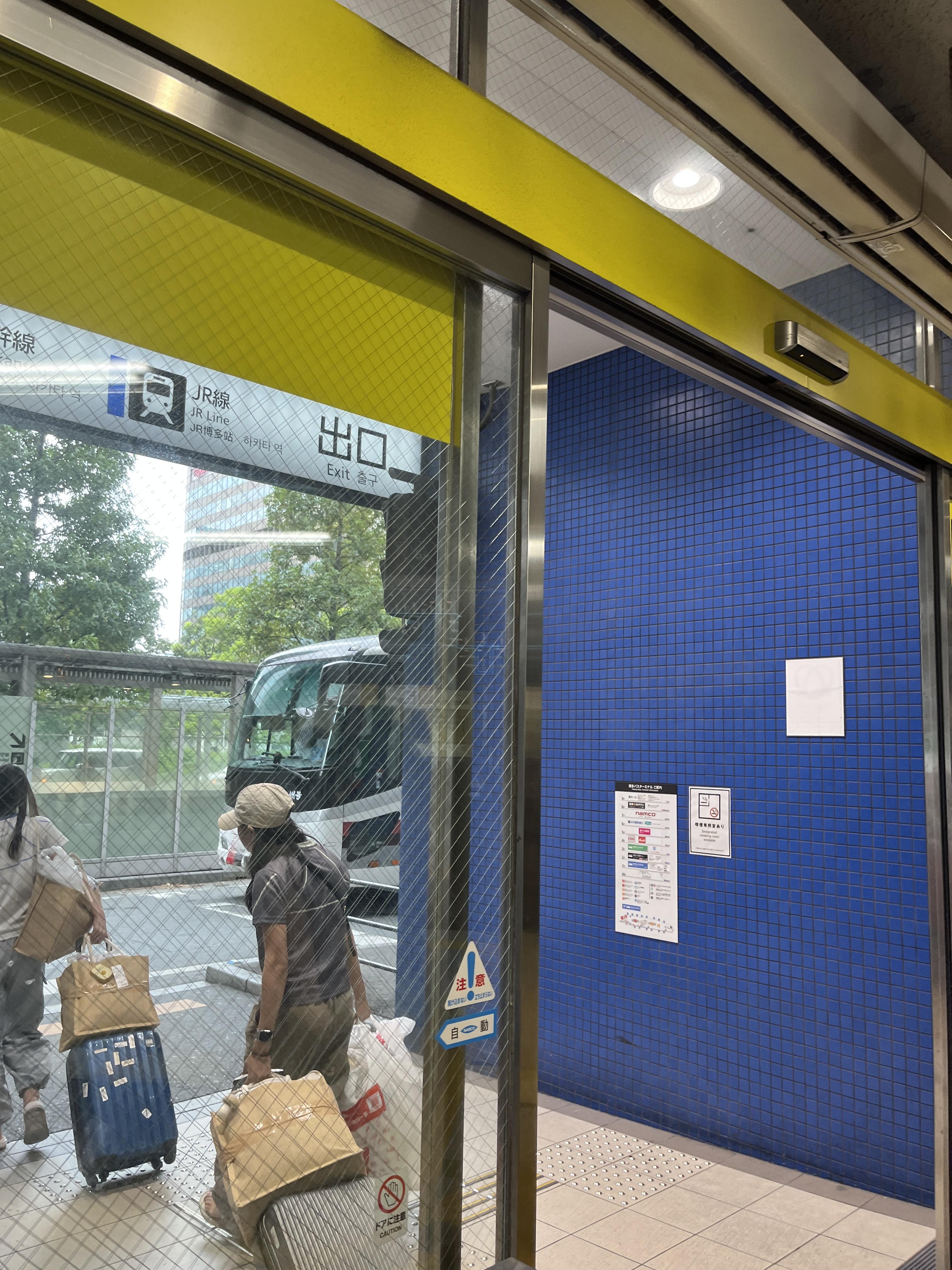 하카타역 버스정류장에서 공항버스를 하차하면 짐을 가지고 한층 밑으로 이동해 주면 아래와 같은 출구가 보이는데요, JR선 타는 방향 쪽으로 나와주신 후에 앞에 보이는 횡단보도를 1번 건너고 우측으로 이동해 주시면 됩니다.