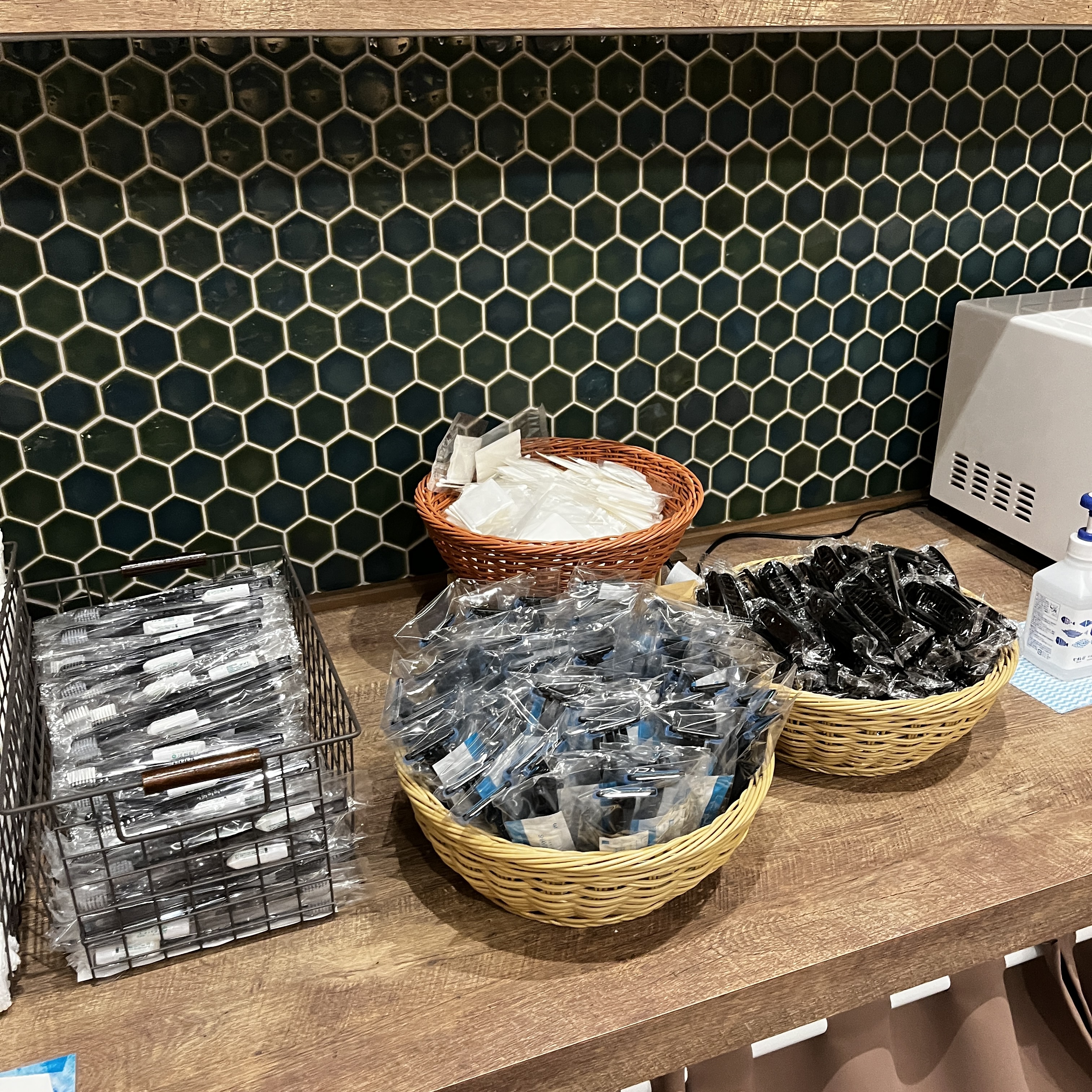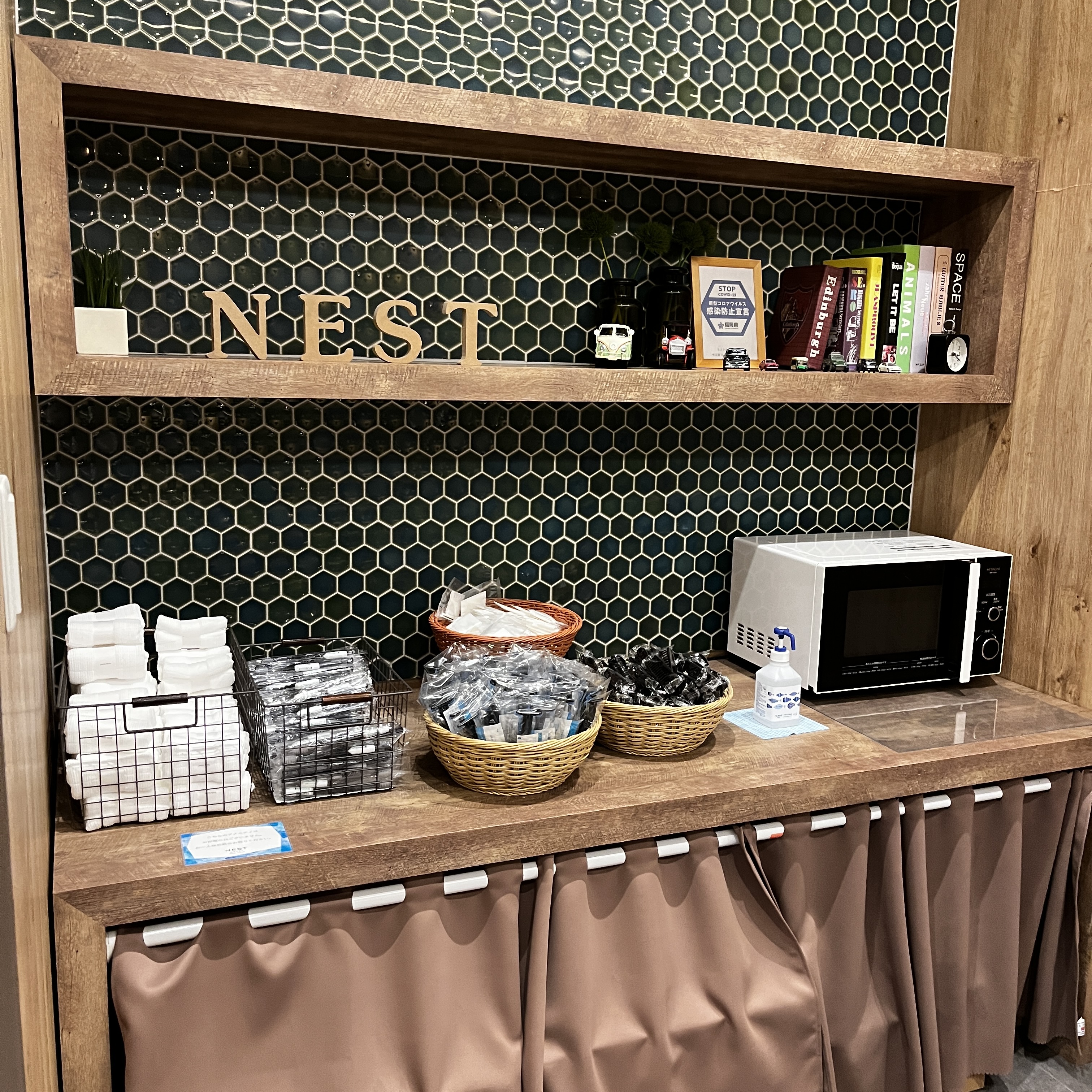 요즘 한국에 있는 비즈니스호텔도 마찬가지이지만, 여기 네스트호텔도 어메니티를 숙소에 구비해두지 않고 호텔 로비에 별도로 분리구비해 두어 필요한 손님들이 필요한 만큼 가져갈 수 있도록 준비해 두었습니다. 치약/칫솔, 샤워타월, 면도기, 머리빗, 면봉이 준비되어 있었습니다. 칫솔은 하루에 하나씩 가져다 사용했고, 머리빗은 하나로 숙박기간 내내 사용했습니다. 우측으로는 전자레인지가 있는 데 사용할 일이 없어서 쓰지 않았습니다.