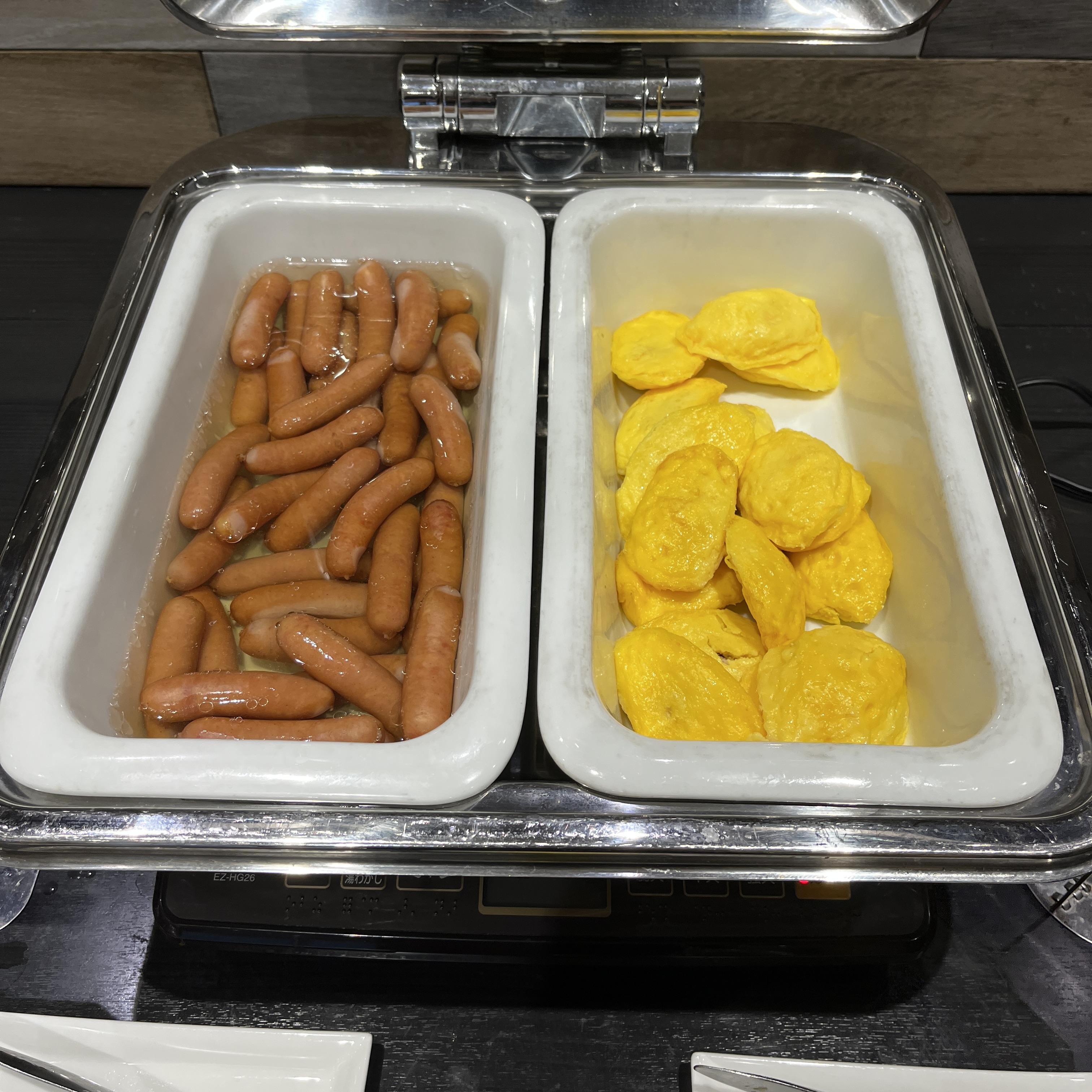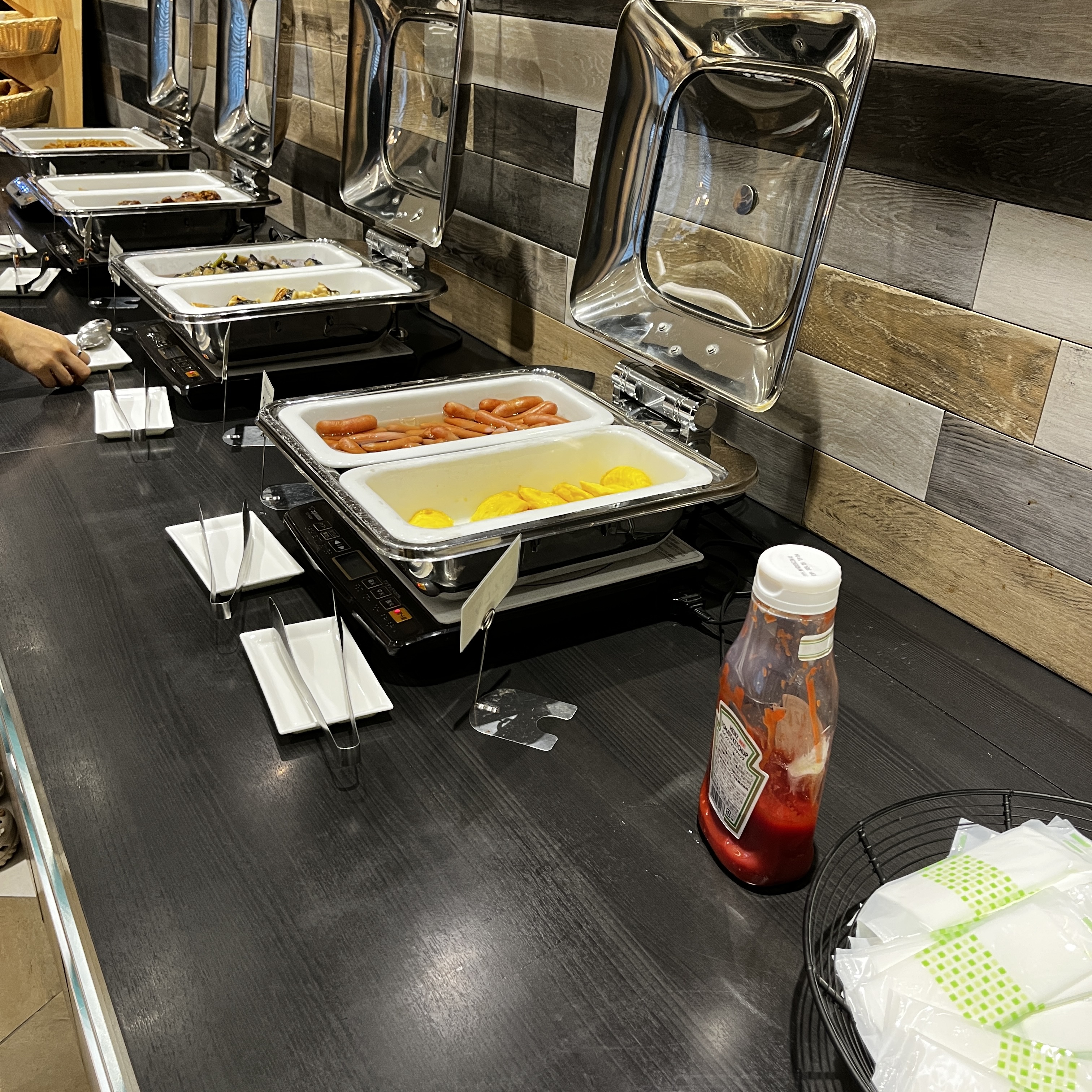 저희가 묵는 첫째 날 조식을 많이 먹어서였을까요? 두 번째 날 조식에는 소시지가 작은 접시가 아닌 큰 접시에 많이 나왔습니다.  오동통하게 살이 오른 소시지는 육즙이 팡팡 터지면서 맛있었고, 약간의 케첩과 함께 좋은 풍미를 느끼게 해 주었지만, 닭고기와 차슈만큼은 못 따라왔습니다. 만약 닭고기와 차슈가 없다면 소시지에 올인했을 것 같습니다.